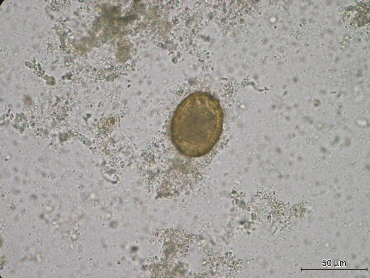 そして写真を確認すると、楕円形で大きさ約50μm黄褐色の虫卵が確認できます。問題文のヒントと写真の両方から、回虫卵であると確認できました。